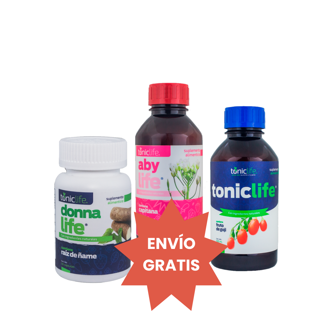 1 frasco tnclife 500 ml, 1 frasco donnalife 60 capsulas y 1 frasco de abyllife 500 ml